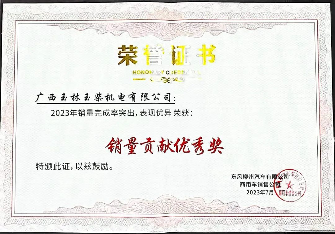 玉柴機(jī)電榮獲東風(fēng)柳汽2023年銷(xiāo)量貢獻(xiàn)優(yōu)秀獎(jiǎng)